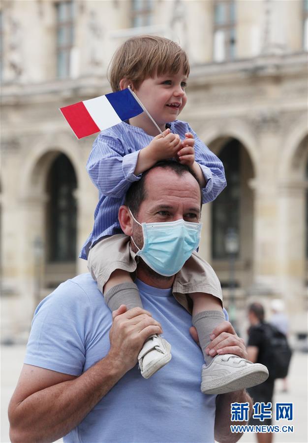 7月14日,在法国巴黎卢浮宫玻璃金字塔广场,一对父子观看国庆阅兵式的飞行表演。新华社记者高静摄