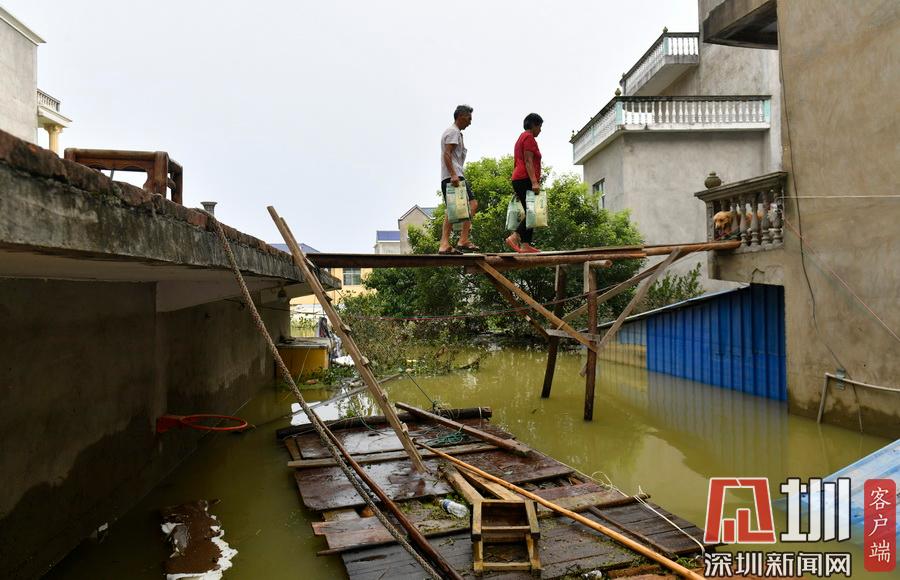 江西鄱阳村庄洪水围困 留守村民划船外出取生活物资