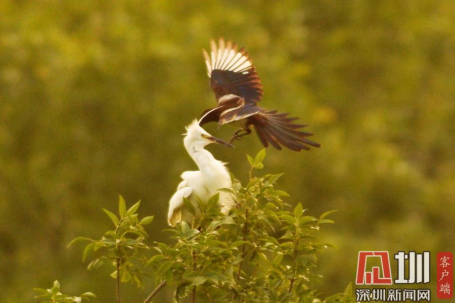 2020年7月14日,在山东省青岛市城阳区红岛街道一处林间,晚归的白鹭与喜鹊在枝头“蹁跹起舞”,优美如画。