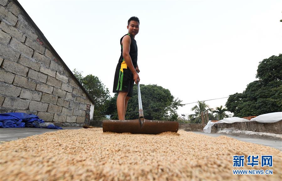 在海南白沙黎族自治县青松乡青松村,村民在屋顶晾晒山兰稻(2019年11月16日)。新华社记者杨冠宇摄