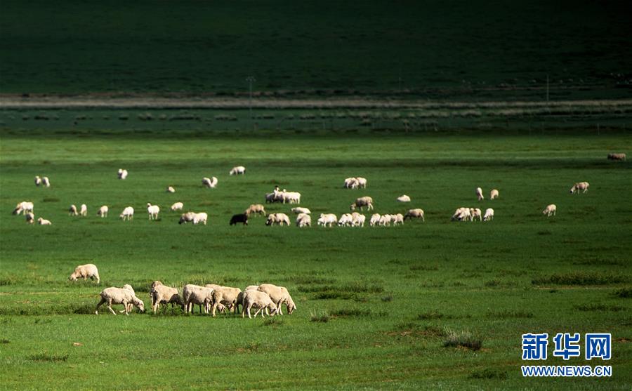 7月18日,羊群在内蒙古锡林郭勒盟正镶白旗境内的草原上觅食。连日来,内蒙古锡林郭勒盟迎来多次降雨,境内广袤的草原经过雨水的滋润,焕发出勃勃生机。新华社记者连振摄