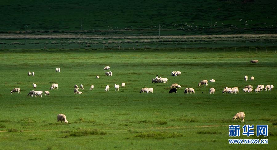 7月18日,羊群在内蒙古锡林郭勒盟正镶白旗境内的草原上觅食。连日来,内蒙古锡林郭勒盟迎来多次降雨,境内广袤的草原经过雨水的滋润,焕发出勃勃生机。新华社记者魏婧宇摄