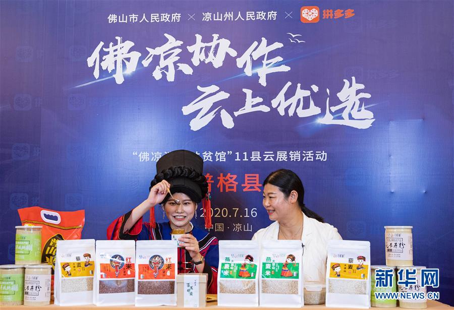 7月16日,直播主持人在电商直播间推介凉山农特产品。新华社记者江宏景摄
