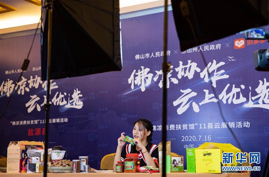 7月16日,直播主持人在电商直播间推介凉山农特产品。新华社记者江宏景摄