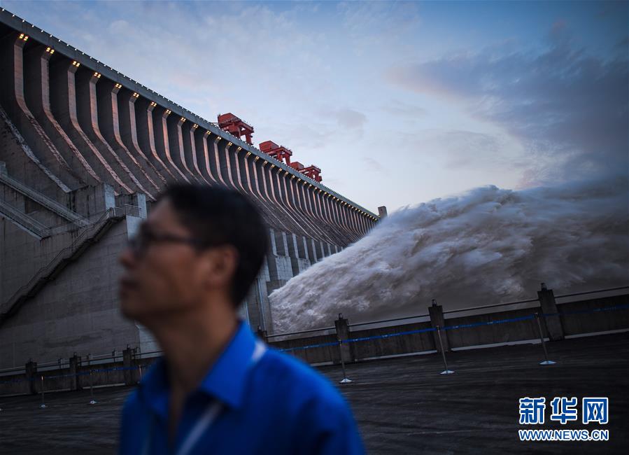 7月19日,工作人员在三峡枢纽前巡查。19日20时,三峡水库入库流量4.6万立方米/秒,较本轮洪水的峰值6.1万立方米/秒下降了1.5万立方米/秒。“长江2020年第2号洪水”平稳通过三峡大坝。新华社记者肖艺九摄