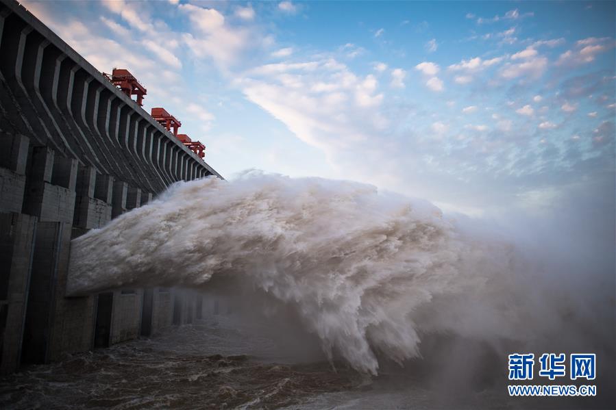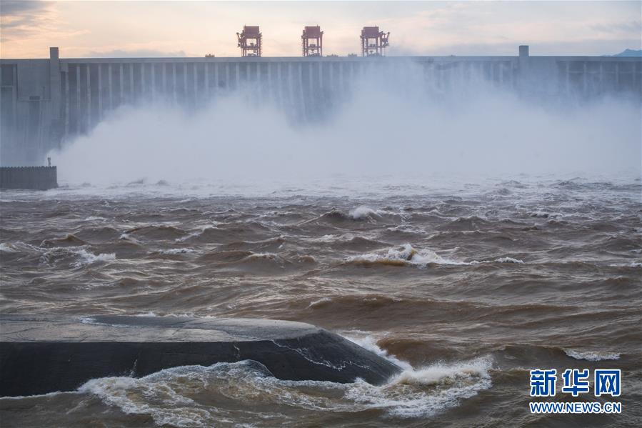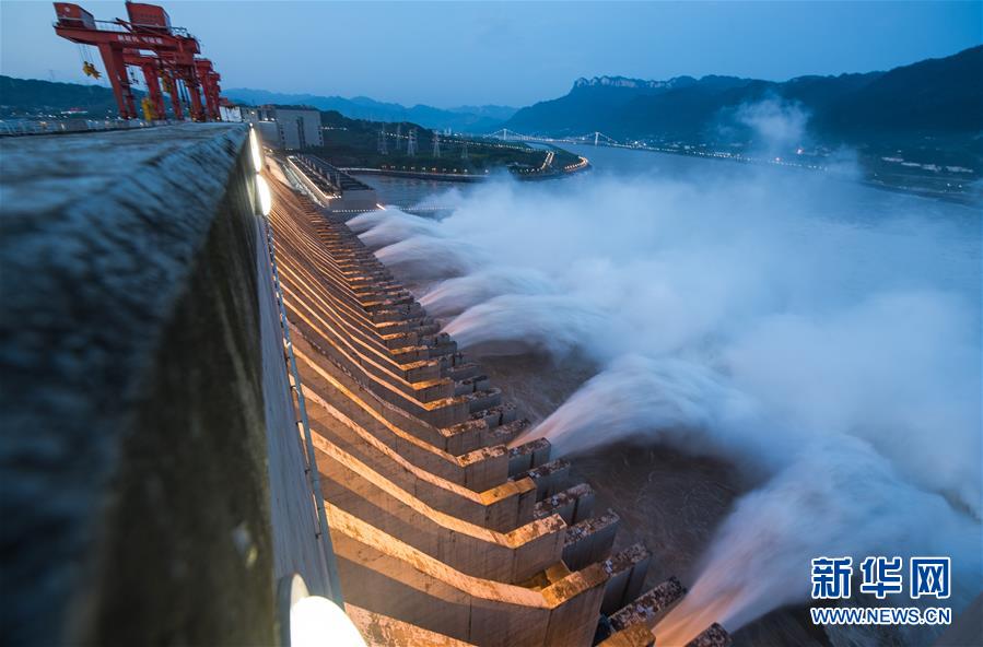 7月19日,三峡枢纽开启泄洪深孔泄洪。19日20时,三峡水库入库流量4.6万立方米/秒,较本轮洪水的峰值6.1万立方米/秒下降了1.5万立方米/秒。“长江2020年第2号洪水”平稳通过三峡大坝。新华社记者肖艺九摄