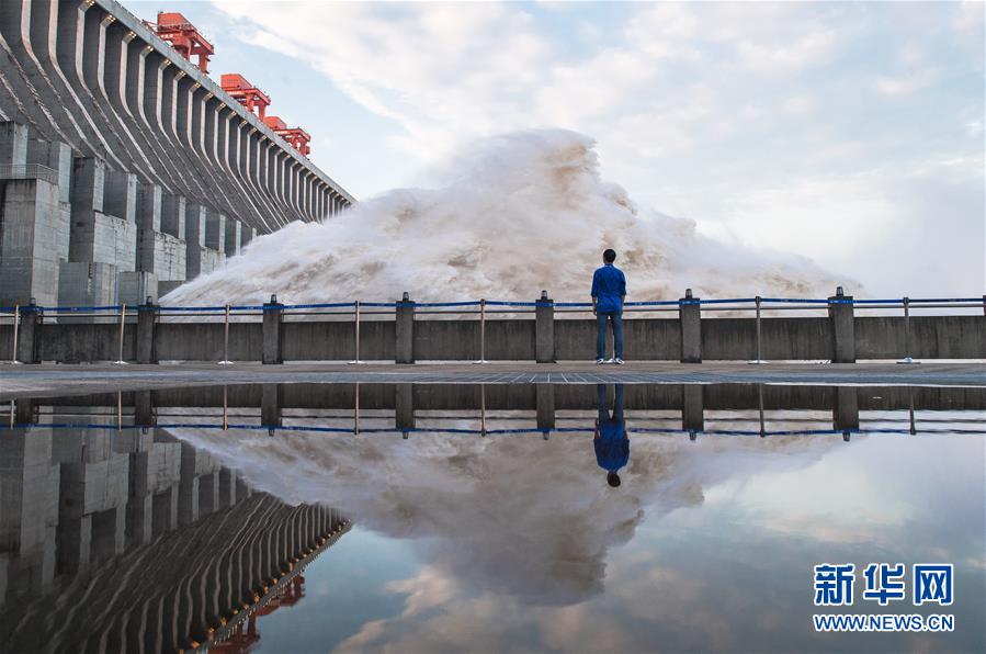 7月19日,工作人员在三峡枢纽前巡查。19日20时,三峡水库入库流量4.6万立方米/秒,较本轮洪水的峰值6.1万立方米/秒下降了1.5万立方米/秒。“长江2020年第2号洪水”平稳通过三峡大坝。新华社记者肖艺九摄