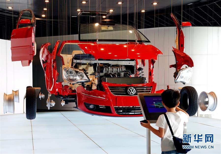 7月19日,一名小朋友在参观了解汽车的部件组成。暑假期间,不少市民和游客来到上海汽车博物馆参观,感受汽车文化魅力。新华社记者刘颖摄