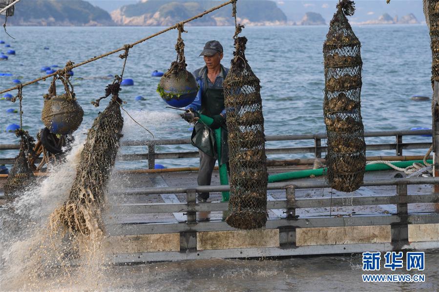 7月16日,在福建省霞浦县长春镇海域,收获生蚝的渔民在冲洗蚝笼。新华社记者姜克红摄