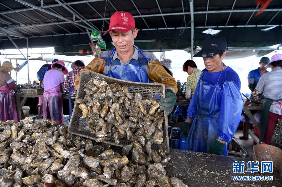 7月16日,在福建省霞浦县长春镇秋竹岗村养殖大户俞开明的海上分拣平台,工人们在分拣生蚝。新华社记者姜克红摄