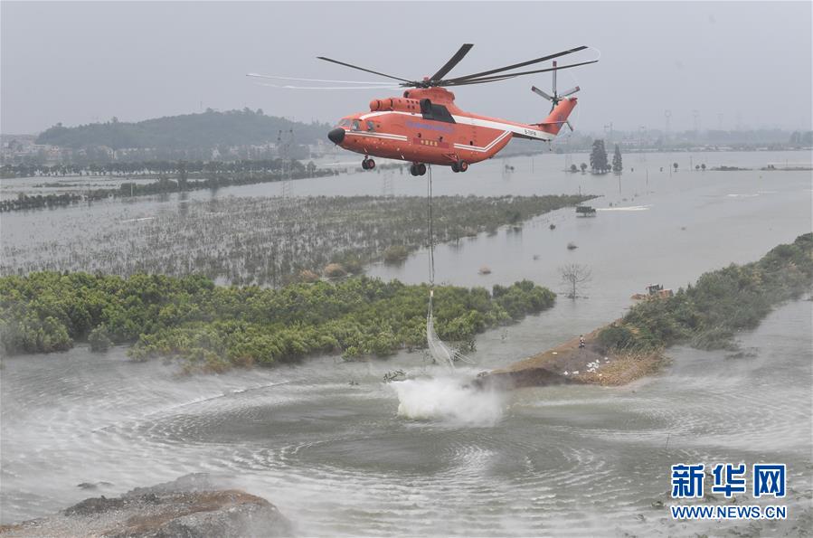 7月16日,湖北省应急管理厅紧急调度直升机,在湖北省阳新县富河干堤葵赛湖下垸溃口上空,空投网兜石块。新华社记者程敏摄