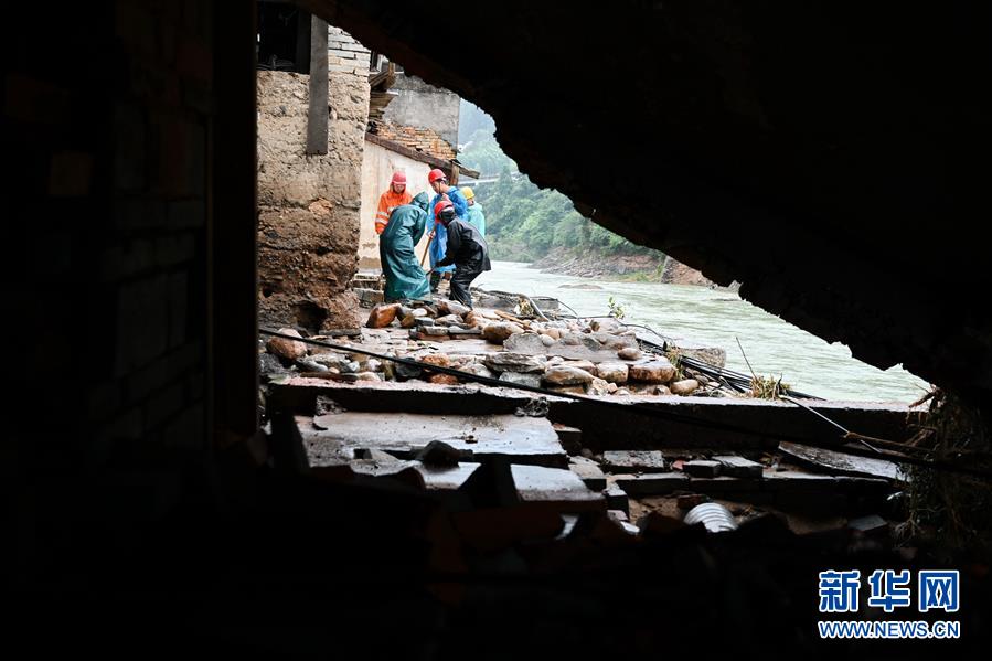 7月10日,救援人员在武夷山市洋庄乡大安村帮助一户受灾村民清理杂物。7月8日以来,福建南平市多个县市普降暴雨或大暴雨,造成部分县市房屋倒塌、农田被淹、道路冲毁。新华社记者林善传摄
