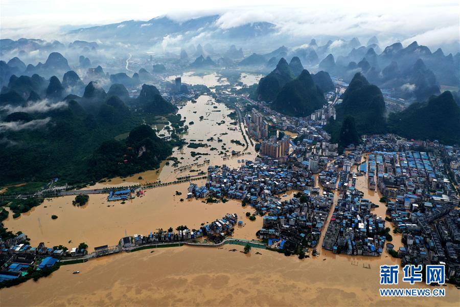 7月11日在广西柳州市融水苗族自治县拍摄的融江(无人机照片)。受连日强降雨影响,广西柳州市融水苗族自治县融江出现超警戒水位。新华社记者黄孝邦摄