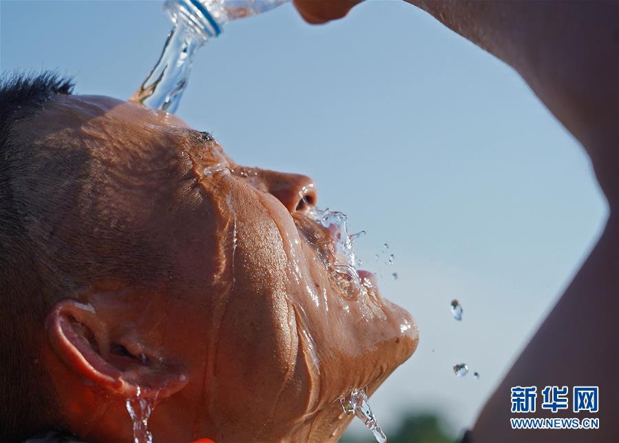 武警江西总队上饶支队的一名战士将矿泉水倒在脸上降温(7月14日摄)。在位于江西省余干县古埠镇的齐埠联圩上,武警江西总队上饶支队的60名战士头顶烈日,挥汗如雨,在泥水中处置一处堤坝坍塌险情。新华社记者万象摄
