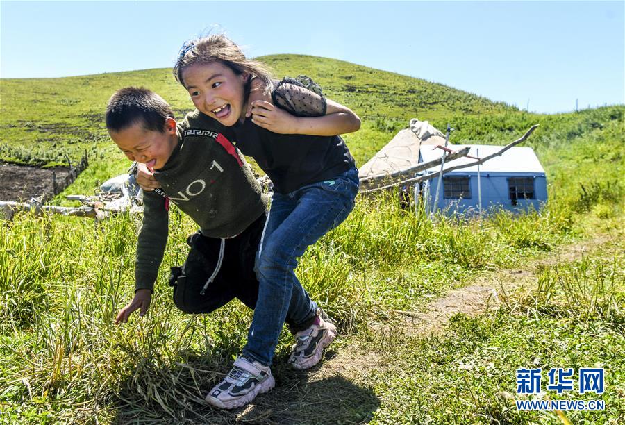 在新疆伊犁特克斯县境内的夏牧场里,两名小朋友在玩耍(7月2日摄)。新华社记者王菲摄
