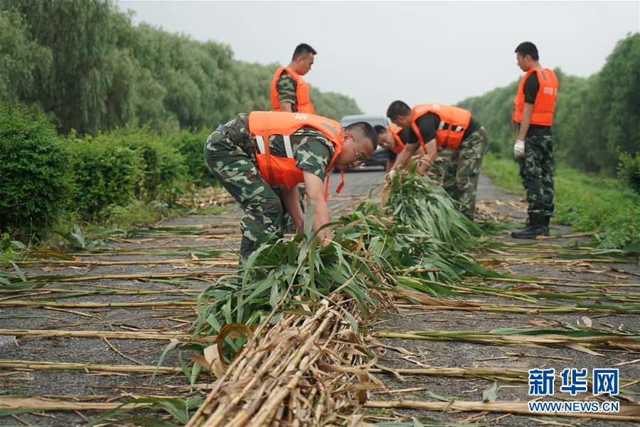在镇江市丹徒区世业镇先锋村西南大堤,中国安能集团第二工程局常州分公司防汛前置备勤队员在捆芦苇护边坡(7月17日摄)。捆芦苇护边坡、机器人进涵洞、“养水盆”防渗漏……在江苏镇江,当地干部群众和专业力量,因地制宜就地取材,老办法搭配新技术,一批险情得以消除在萌芽状态。新华社记者季春鹏摄