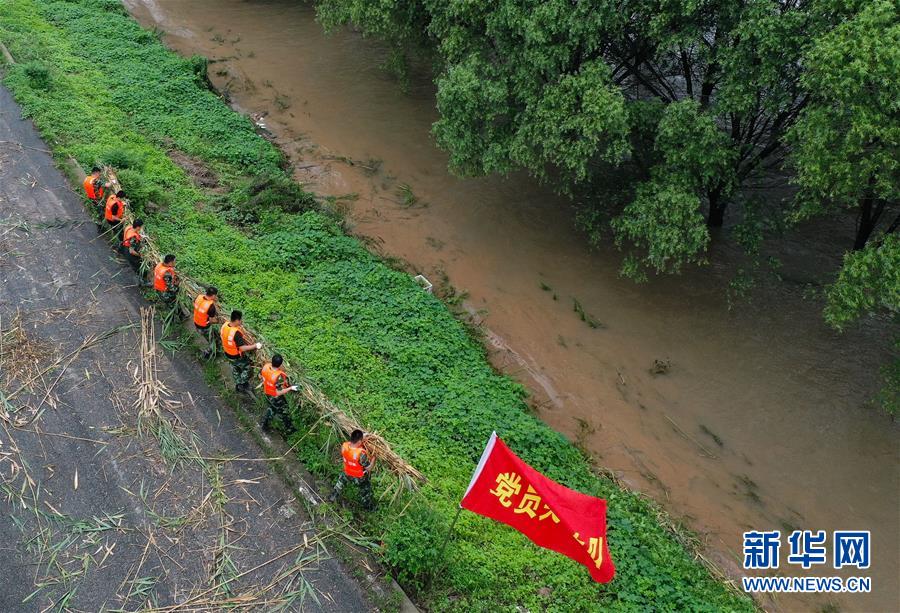 在镇江市丹徒区世业镇先锋村西南大堤,中国安能集团第二工程局常州分公司防汛前置备勤队员准备将捆好的芦苇放在江堤边(7月17日摄,无人机照片)。捆芦苇护边坡、机器人进涵洞、“养水盆”防渗漏……在江苏镇江,当地干部群众和专业力量,因地制宜就地取材,老办法搭配新技术,一批险情得以消除在萌芽状态。新华社记者季春鹏摄