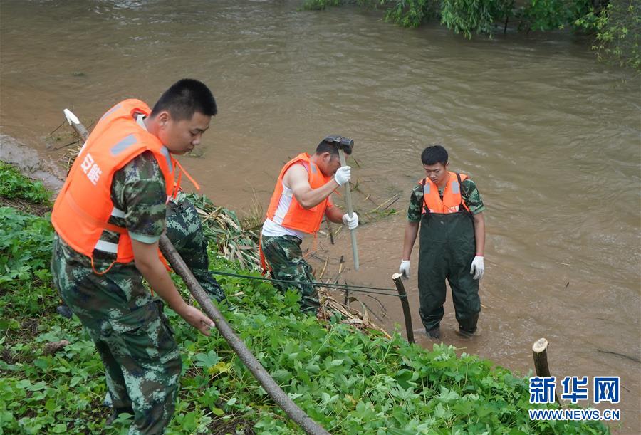 在镇江市丹徒区世业镇先锋村西南大堤,中国安能集团第二工程局常州分公司防汛前置备勤队员在打桩,用来固定捆好的芦苇(7月17日摄)。捆芦苇护边坡、机器人进涵洞、“养水盆”防渗漏……在江苏镇江,当地干部群众和专业力量,因地制宜就地取材,老办法搭配新技术,一批险情得以消除在萌芽状态。新华社记者季春鹏摄