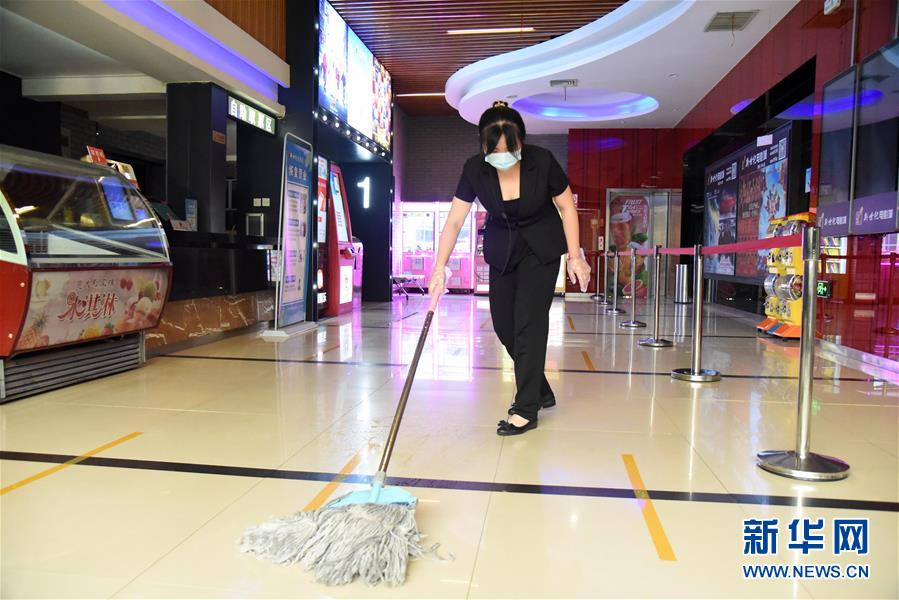 7月20日,济南新世纪电影城阳光100店的员工在对影院设施进行消杀。当日,山东济南市部分电影院在严格防控疫情的基础上陆续恢复开放。新华社记者王凯摄