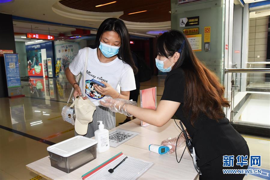 7月20日,济南新世纪电影城阳光100店的员工(右)在核对观众的健康码。当日,山东济南市部分电影院在严格防控疫情的基础上陆续恢复开放。新华社记者王凯摄