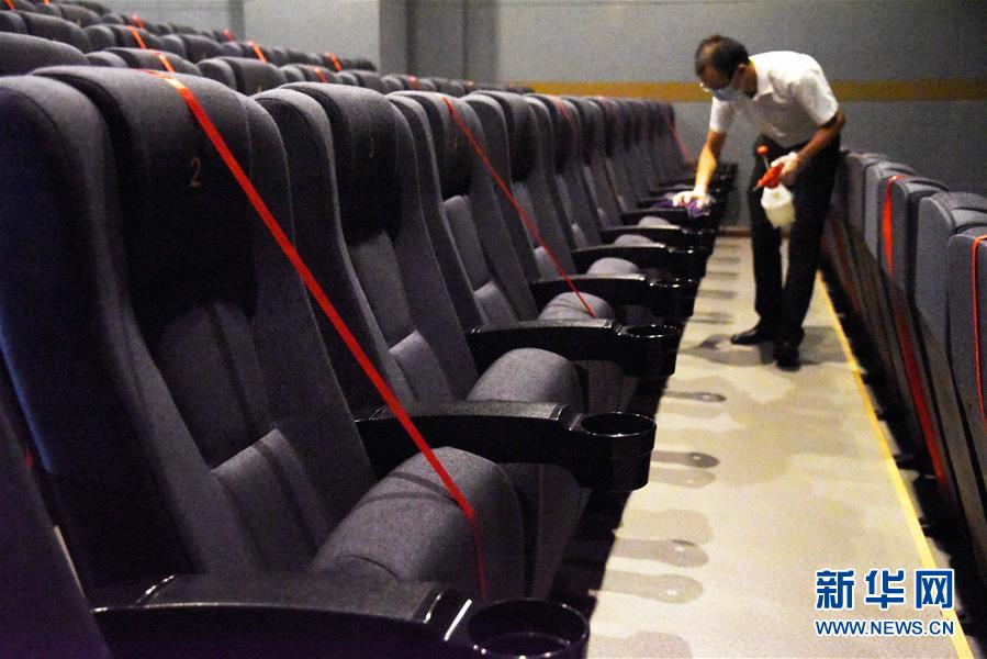 7月20日,济南新世纪电影城阳光100店的员工在对影院设施进行消杀。当日,山东济南市部分电影院在严格防控疫情的基础上陆续恢复开放。新华社记者王凯摄