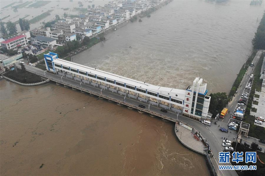 7月20日,洪水通过王家坝闸涌入蒙洼蓄洪区(无人机照片)。当日8时32分,淮河干流王家坝闸开闸泄洪。受近期强降雨影响,淮河干流王家坝站水位19日快速上涨,7月20日6时36分水位涨至29.66米,超过保证水位0.36米。淮河王家坝闸开闸泄洪,蒙洼蓄洪区启用。新华社记者黄博涵摄