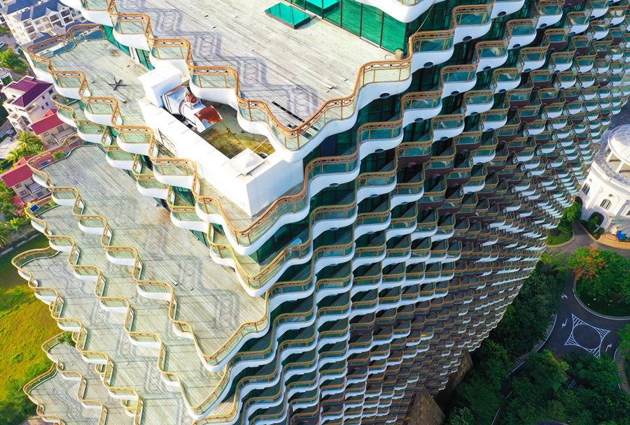 2020年7月20日,海南省三亚市,图为航拍的“九棵大树”建筑群。建筑物阳台均为波浪形,视野良好,契合三亚“海”的属性。