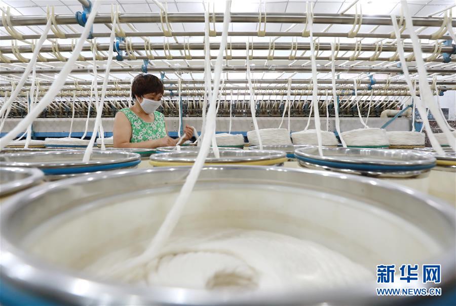7月20日,工人在滦南县长凝镇的一家纺织厂生产车间里工作。近年来,河北省滦南县大力发展村边民营企业,引导企业在乡镇村边建厂,带动当地3万多名农村群众在村边就近就业,实现稳步增收。新华社记者杨世尧摄