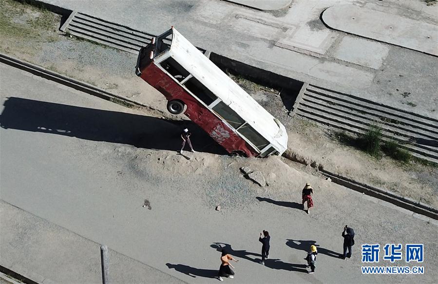 2019年8月23日,游客在阿克塞老县城一处因拍摄电影而设置的景观前拍照(无人机照片)。