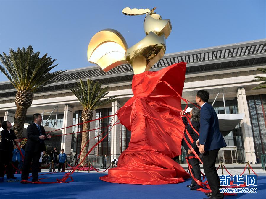 2019年11月19日,嘉宾为第28届金鸡百花电影节金鸡雕塑揭幕。当日,第28届金鸡百花电影节金鸡雕塑揭幕仪式在厦门海峡大剧院前广场举行。新华社记者姜克红摄