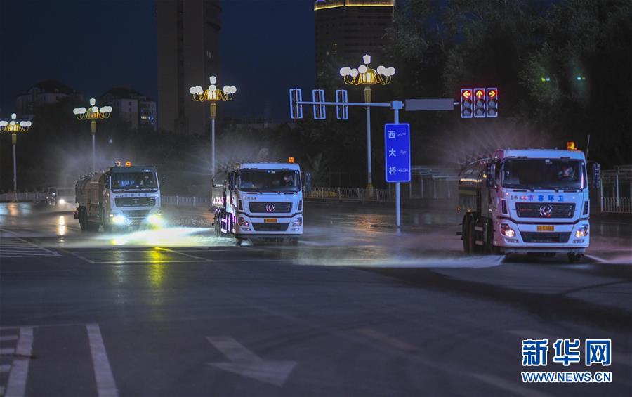 7月20日,乌鲁木齐市天山区城管局清运队的三台工作车辆在市区光明路进行消杀作业。乌鲁木齐市天山区城管局自7月17日起,对天山区的主次干道76条及235条巷道进行集中消杀。目前,乌鲁木齐市对重点区域进行全面消毒消杀。新华社记者赵戈摄