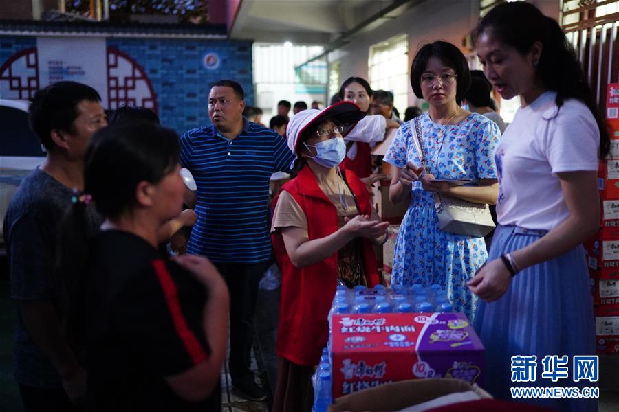 7月9日,在江西鄱阳县鄱阳镇集中安置点,志愿者和工作人员为村民分配物资。新华社记者周密摄