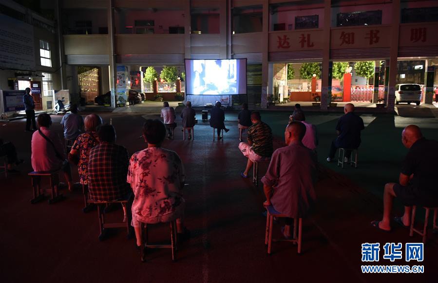 7月20日,转移安置的群众在安徽省安庆市迎江区华中路三小集中安置点看露天电影。新华社记者周牧摄