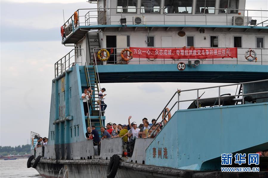 在江西省九江市柴桑区江新洲的渡口,部分居民登上渡轮撤离(7月12日摄)。新华社记者彭昭之摄
