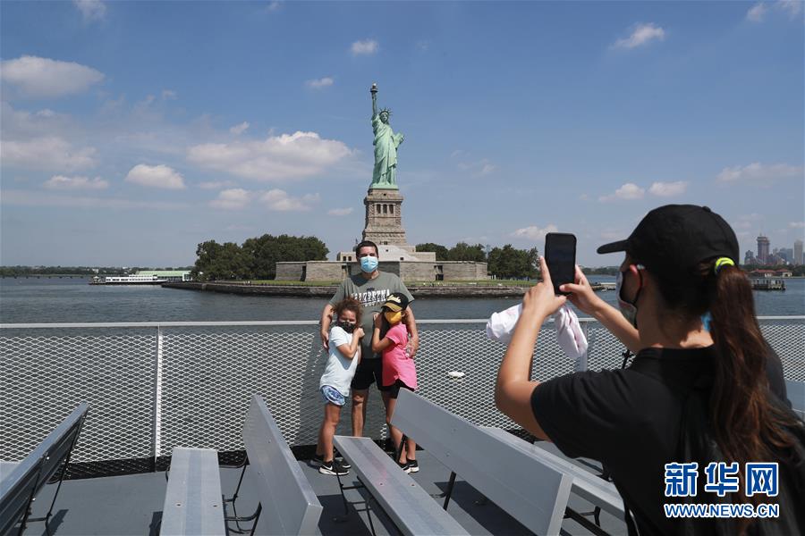 7月20日,参观者在美国纽约前往自由岛的游艇上拍照留念。美国纽约市20日继续推进经济重启计划,宣布开始进入解封新阶段,进一步允许部分低风险文娱活动重启。自由女神像所在的自由岛对公众开放,但雕像内部和博物馆仍关闭。新华社记者王迎摄