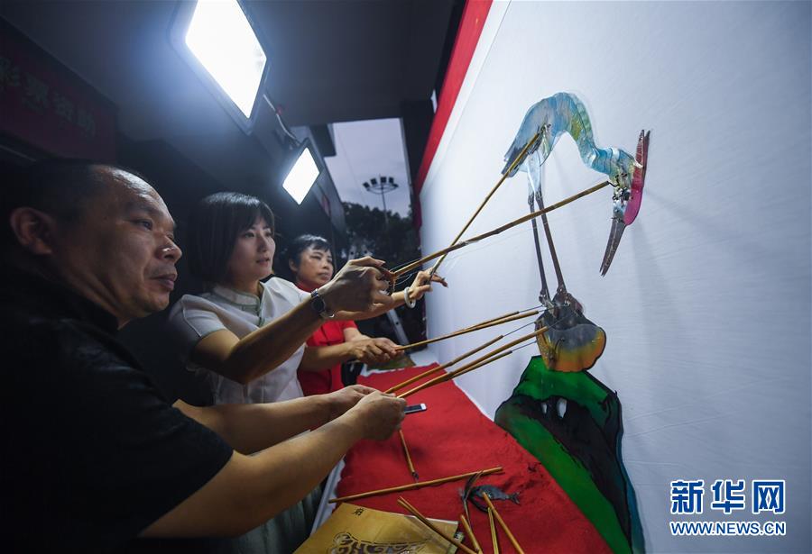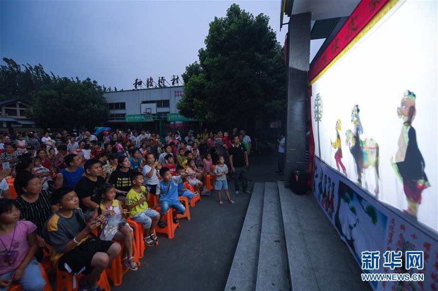 当日,浙江省杭州市余杭区塘栖镇河西埭村“卫家班皮影戏”剧团的艺人们来到余杭区乔司街道和睦桥村进行演出,这是近期杭州市余杭区夏季乡村“文化走亲”的重要活动之一。今年6月开始,杭州市余杭区塘栖镇组织多支文化表演团体以“文化走亲”的形式,先后送戏到余杭区近20个乡村文化礼堂,丰富夏日乡村百姓文化生活。在余杭塘栖一带,历史上曾活跃着一支以演出皮影戏出名的民间戏班子,号称“卫家班”。2016年,塘栖镇河西埭村在文化礼堂的建设过程中,将当地传统的“卫家班皮影戏”作为“一村一品”特色项目进行了抢救性保护。2018年12月,“卫家班皮影戏”被列入杭州市非物质文化遗产代表性项目名录。新华社记者徐昱摄