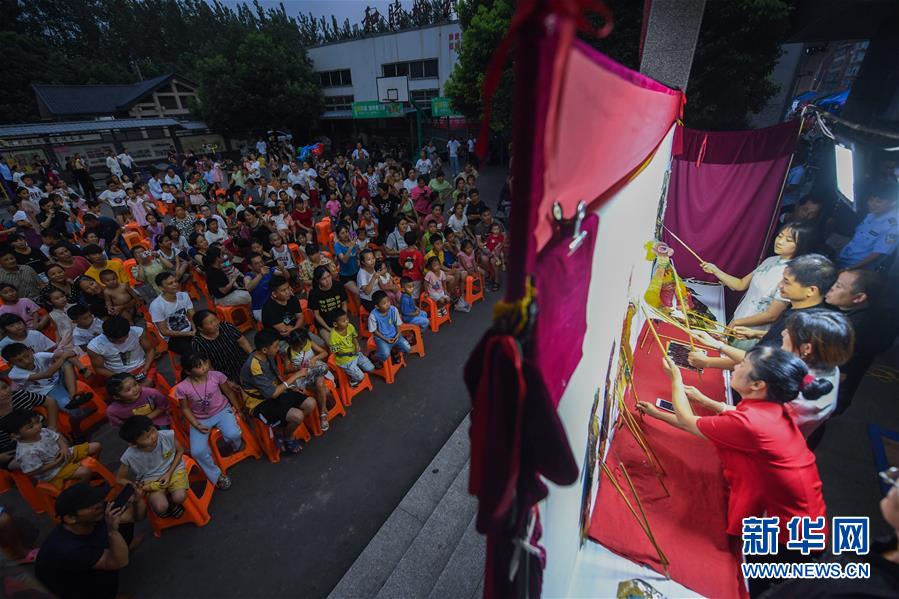 7月21日,和睦桥村的村民们在文化礼堂观看皮影戏表演。新华社记者徐昱摄