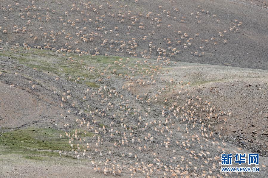 7月17日,藏羚羊群在西藏尼玛县荣玛乡附近悠闲吃草。2000年,西藏羌塘自然保护区晋升为国家级自然保护区。20年来,经过西藏各级各部门的不懈努力,羌塘国家级自然保护区内的重点保护野生动物种群数量明显增加,其中,藏羚羊种群数量由原来的5至7万只,恢复到目前的15万只以上。羌塘国家级自然保护区核心地带的西藏尼玛县荣玛乡附近,目前就有近6万只藏羚羊。新华社记者觉果摄