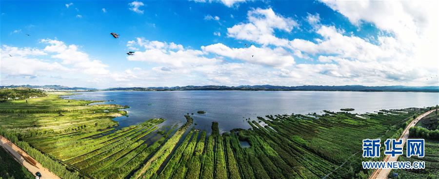 与威宁县城紧紧相依的草海(6月10日摄无人机照片)。新华社记者杨文斌摄