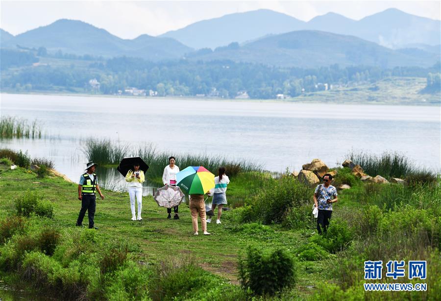草海巡护员(左一)在劝导游客不要擅自进入草海保护区内游览(6月10日摄)。新华社记者杨文斌摄