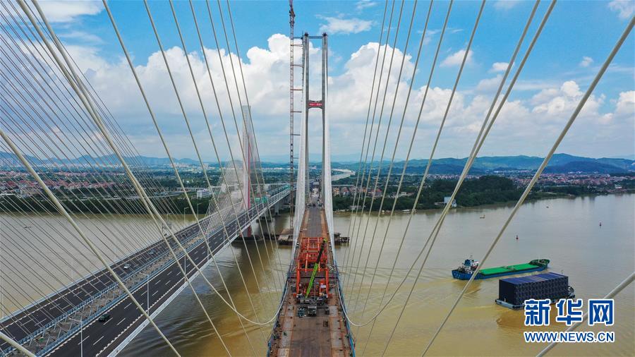 7月22日拍摄的广州南沙港铁路跨西江特大斜拉桥最后一组斜拉索吊装现场(无人机照片)。新华社记者刘大伟摄