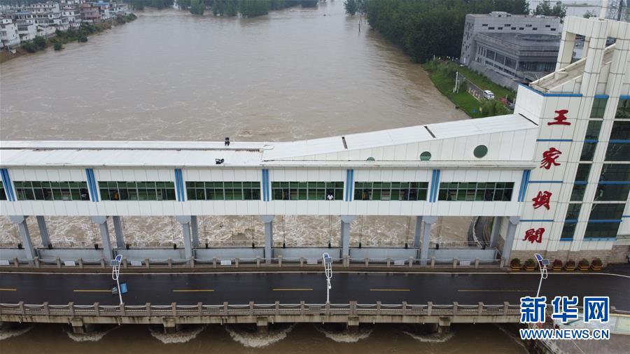 这是7月22日在安徽省阜南县拍摄的淮河王家坝闸(无人机照片)。7月22日14时,淮河王家坝水位降至28.73米,超警戒水位1.23米,低于保证水位0.57米。新华社记者张端摄