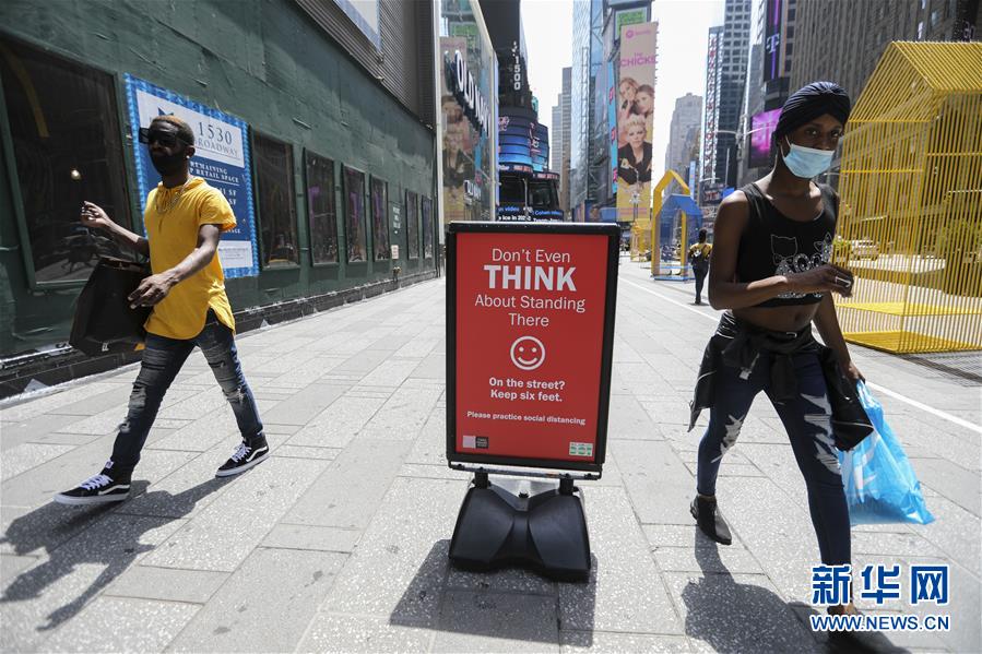 7月23日,在美国纽约时报广场,人们从保持社交距离的提示牌旁走过。美国约翰斯·霍普金斯大学23日发布的新冠疫情最新统计数据显示,美国累计确诊病例超过400万例。数据显示,截至美国东部时间23日15时34分(北京时间24日3时34分),美国累计确诊病例4007859例,累计死亡病例143846例。新华社记者王迎摄