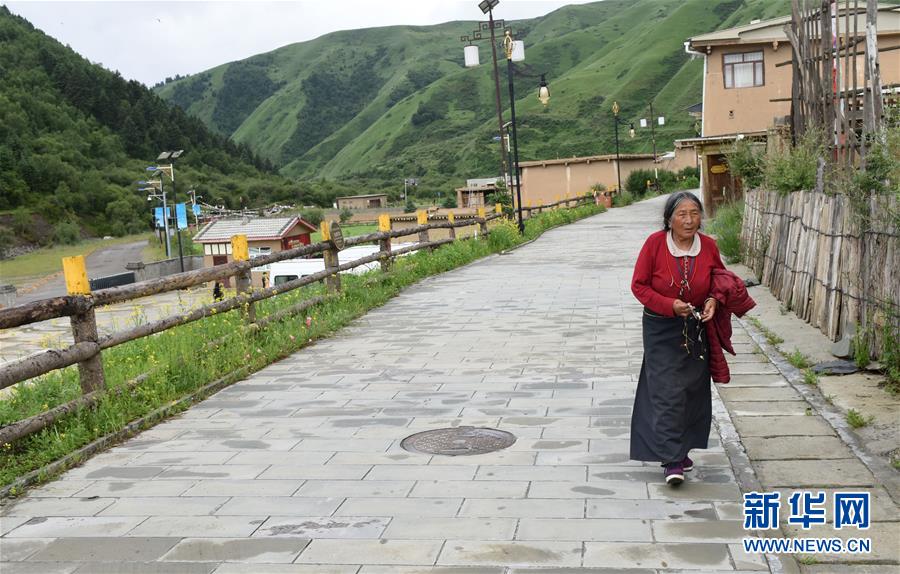 7月5日,一名藏族村民走在阿坝县查理乡神座村里。新华社记者陈燮摄