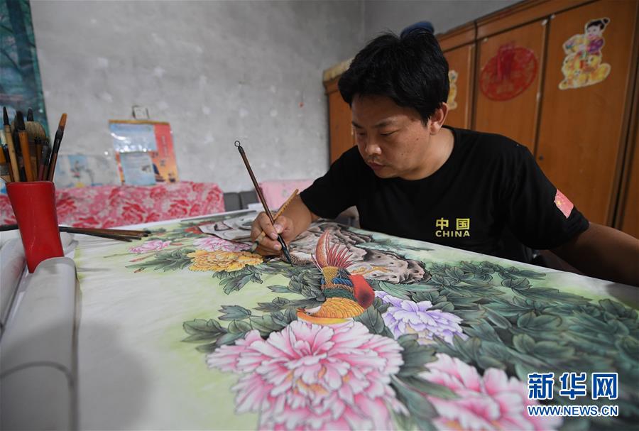 7月22日,王红彬在家中创作工笔画。新华社记者朱旭东摄
