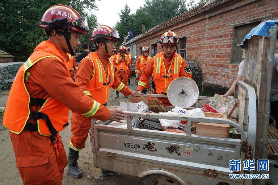 7月23日,淮安市消防救援支队队员在盱眙县鲍集镇新迁村帮助村民转移车辆。当日,受淮河盱眙段水位上涨影响,江苏省淮安市盱眙县启动鲍集圩行洪区万余名群众撤离转移工作,确保安全度汛。新华社记者韩瑜庆摄