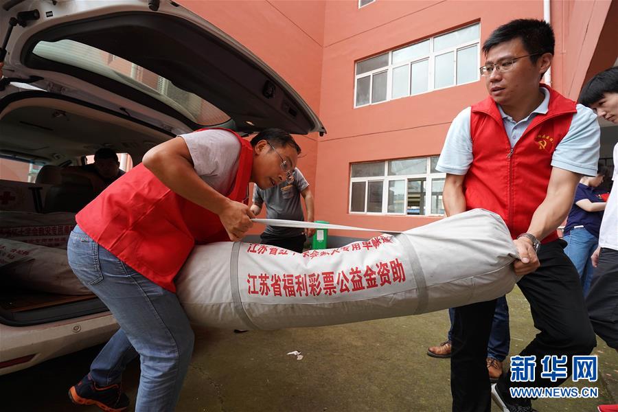 7月23日,工作人员在盱眙县鲍集小学安置点搬运帐篷。当日,受淮河盱眙段水位上涨影响,江苏省淮安市盱眙县启动鲍集圩行洪区万余名群众撤离转移工作,确保安全度汛。新华社记者韩瑜庆摄