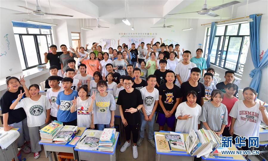 在融水苗族自治县丹江中学1708班举办的送别班会上,支教老师温昌浩(前排居中黑色衣服)和同学们合影(7月23日摄)。新华社记者黄孝邦摄