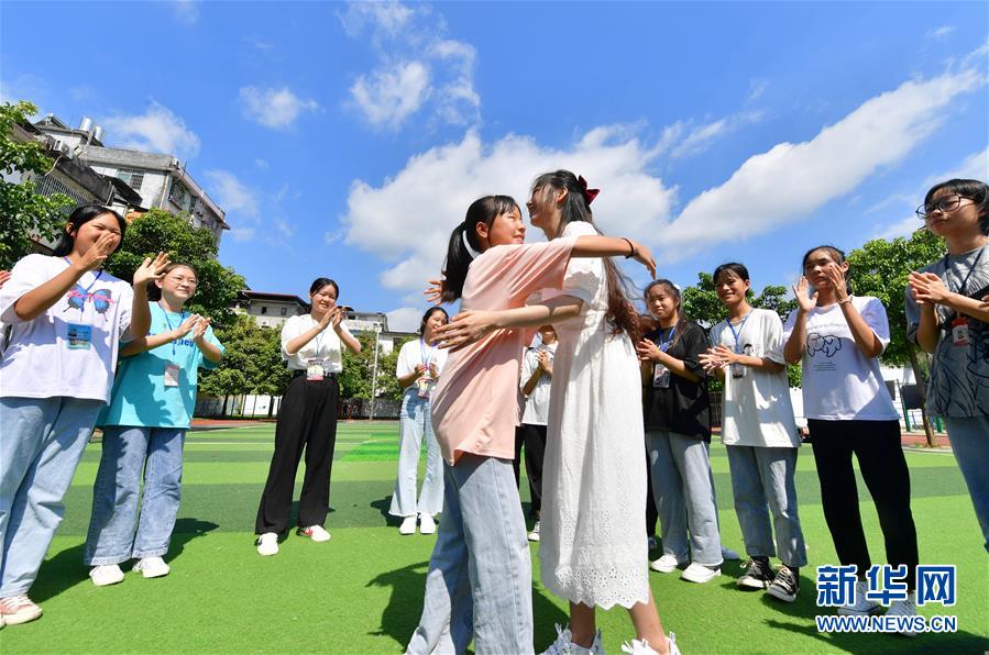 在融水苗族自治县保桓中学1813班举办的送别班会上,支教老师林洋港(中右)和同学们拥抱告别(7月23日摄)。新华社记者黄孝邦摄