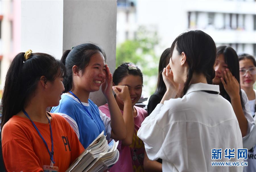 在融水苗族自治县民族中学1818班举办的送别班会上,同学们与支教老师高洁(前右)道别(7月23日摄)。新华社记者黄孝邦摄